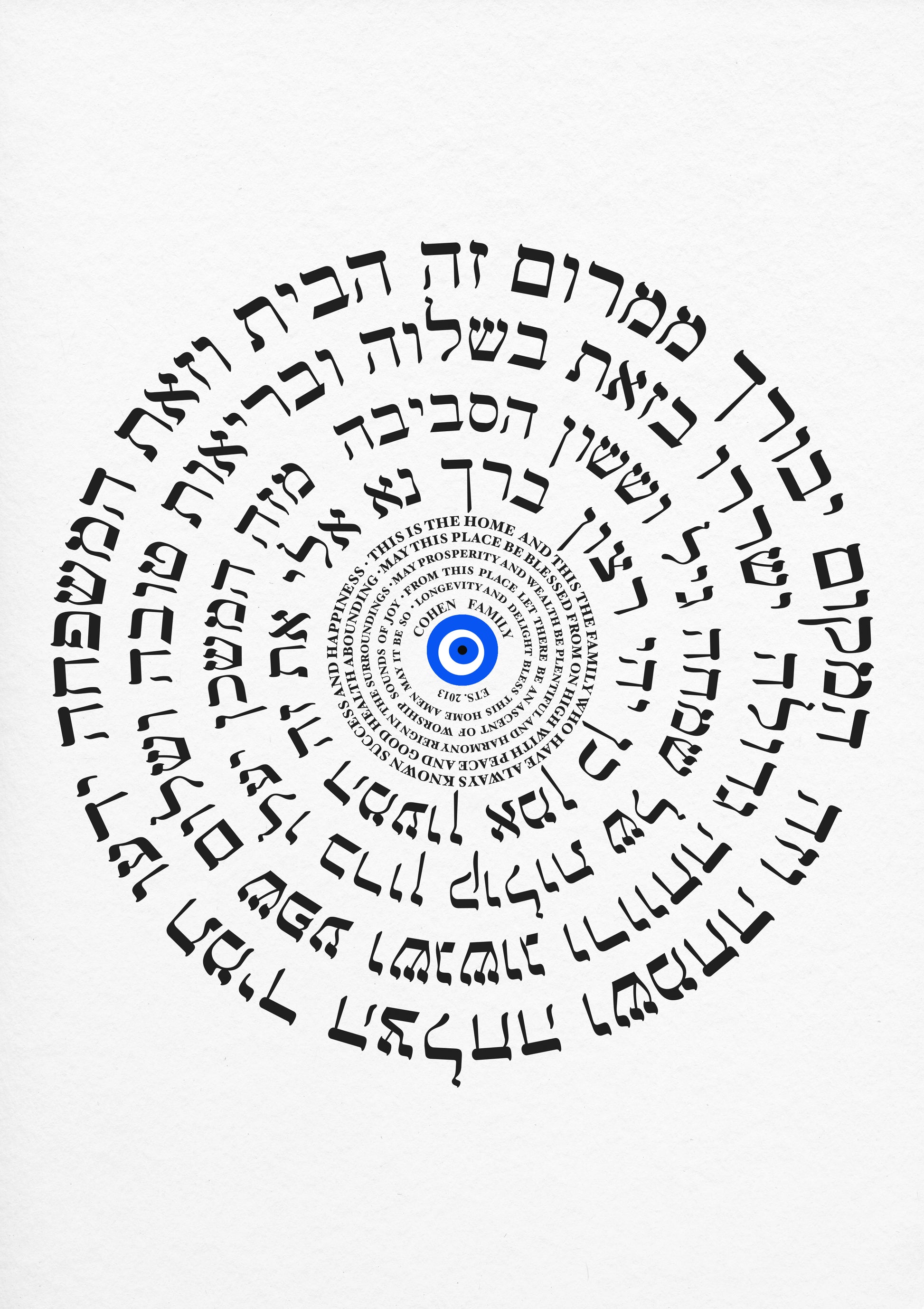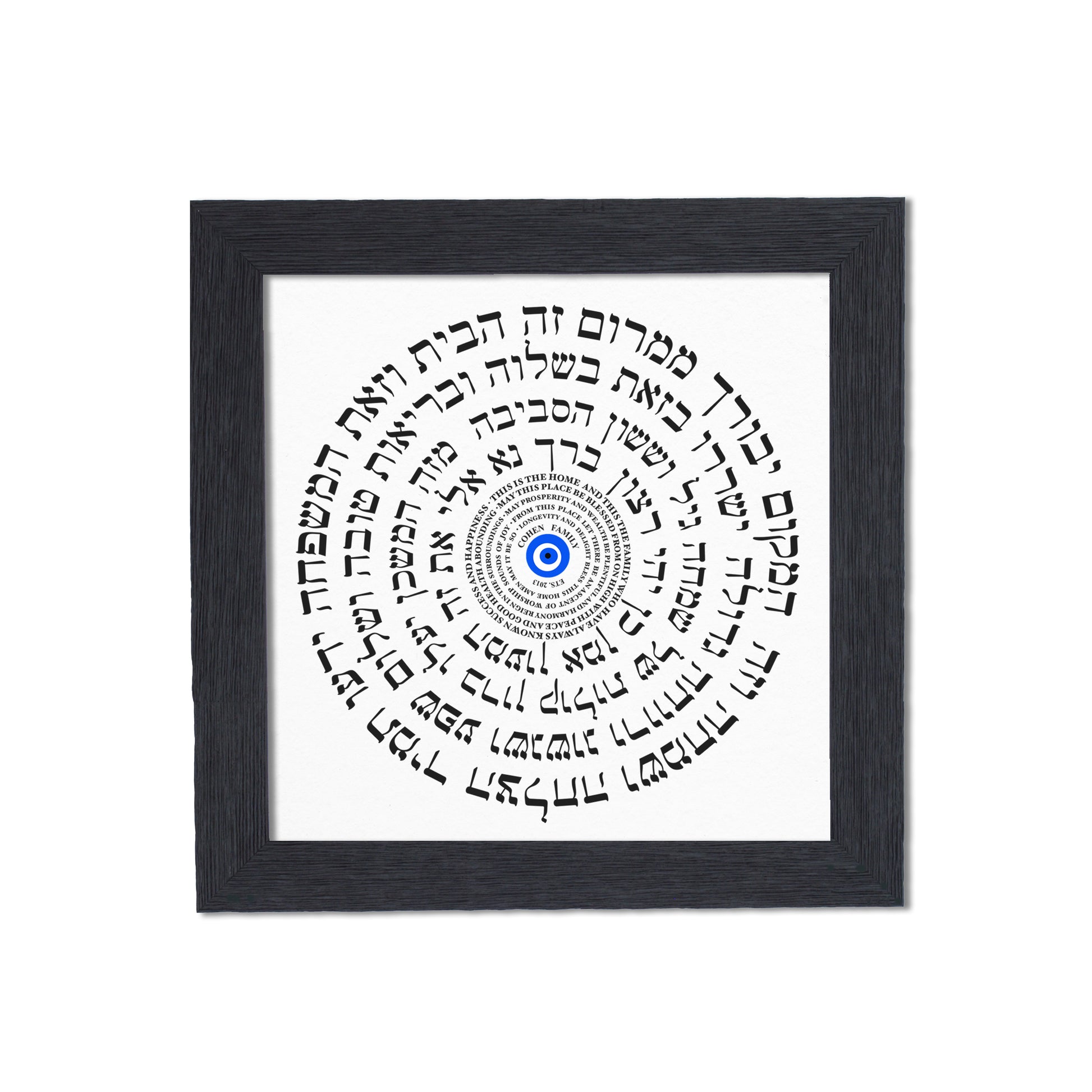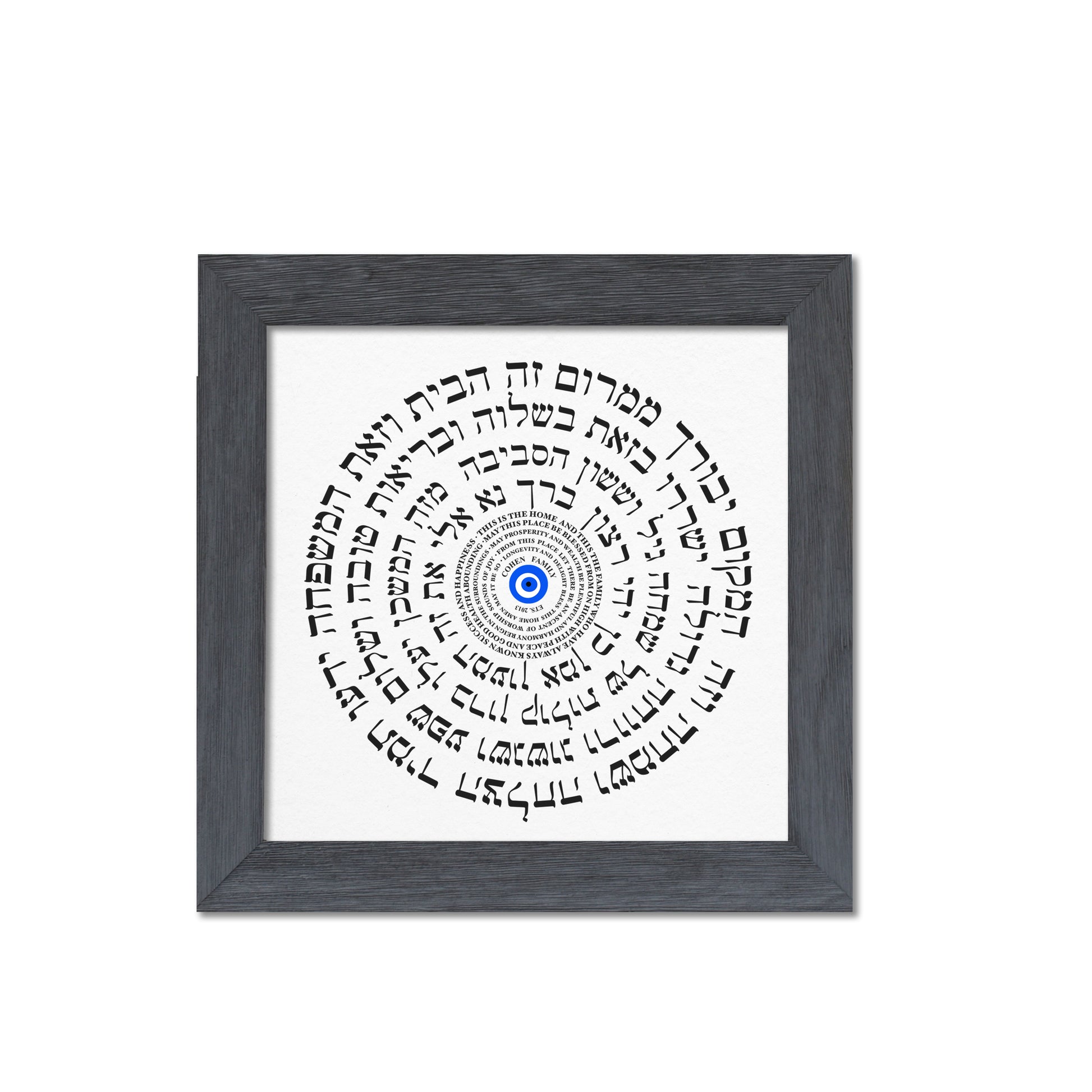 Bring harmony, protection, and beauty into your home with this elegant Home Blessing, featuring both English and Hebrew text arranged in a captivating circular design. At the center rests the traditional evil eye symbol, believed to bring protection, positivity, and good energy to your space.